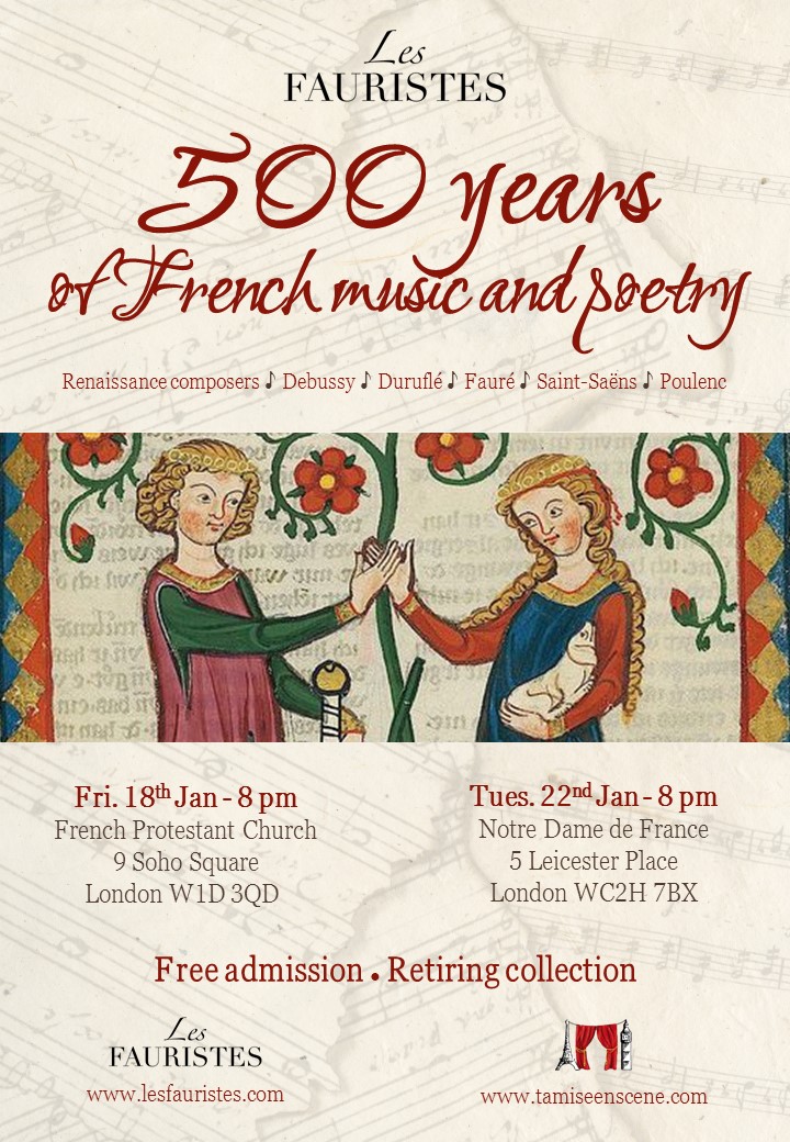 Après le succès de leur programme 100% Mozart en juin dernier, les Fauristes sont de retour avec un programme 100 % Musique Française qu’ils chanteront Vendredi 18 janvier 2019 à 20h en l’Eglise Protestante Française de Londres, en soutien au projet rénovation de l’Eglise.