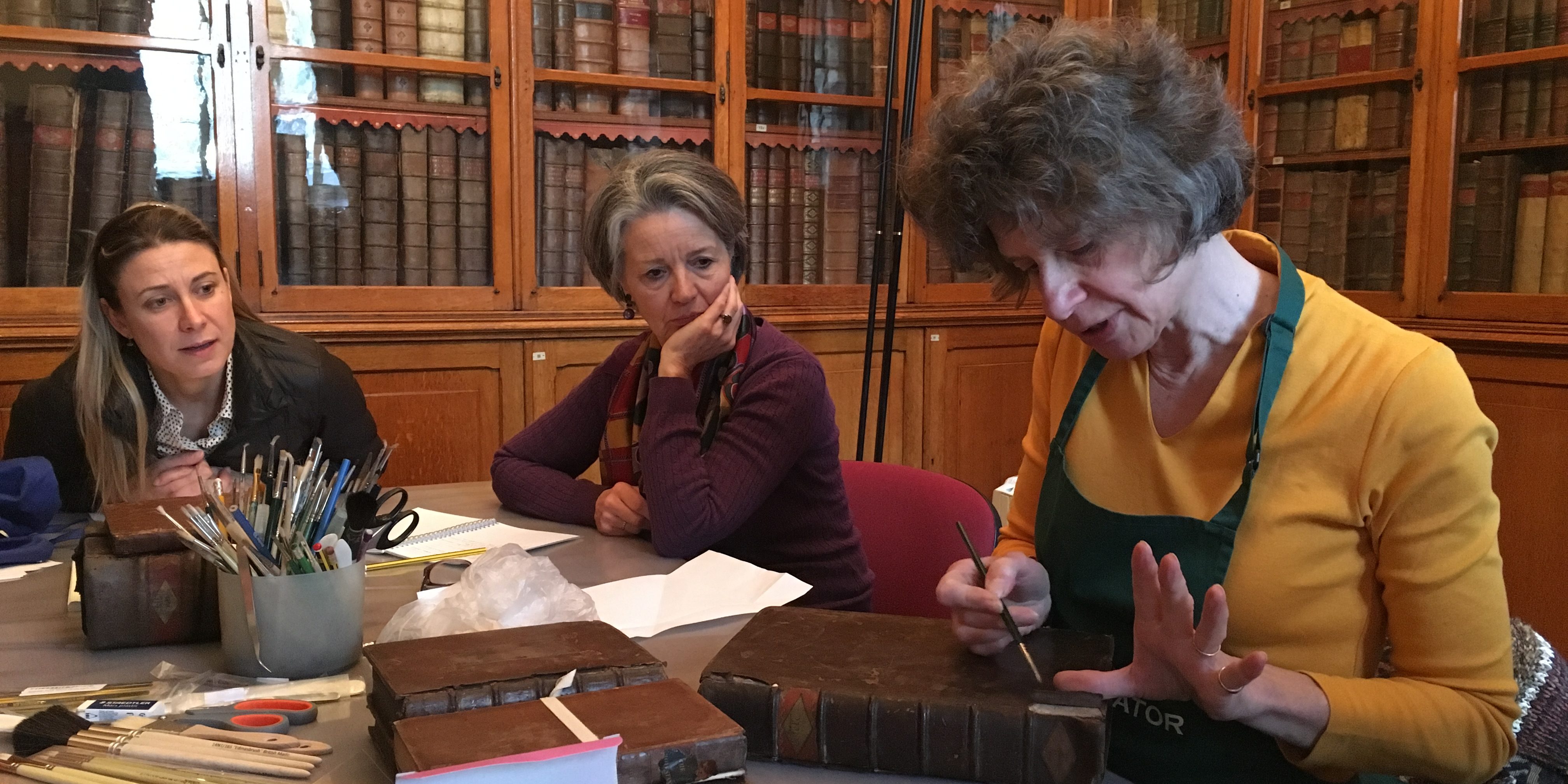 L’équipe est à l’œuvre depuis février pour un travail de fourmis très salissant, étape obligatoire pour identifier les livres qui devront faire l’objet d’une restauration plus poussée en studio et stabiliser les autres.
