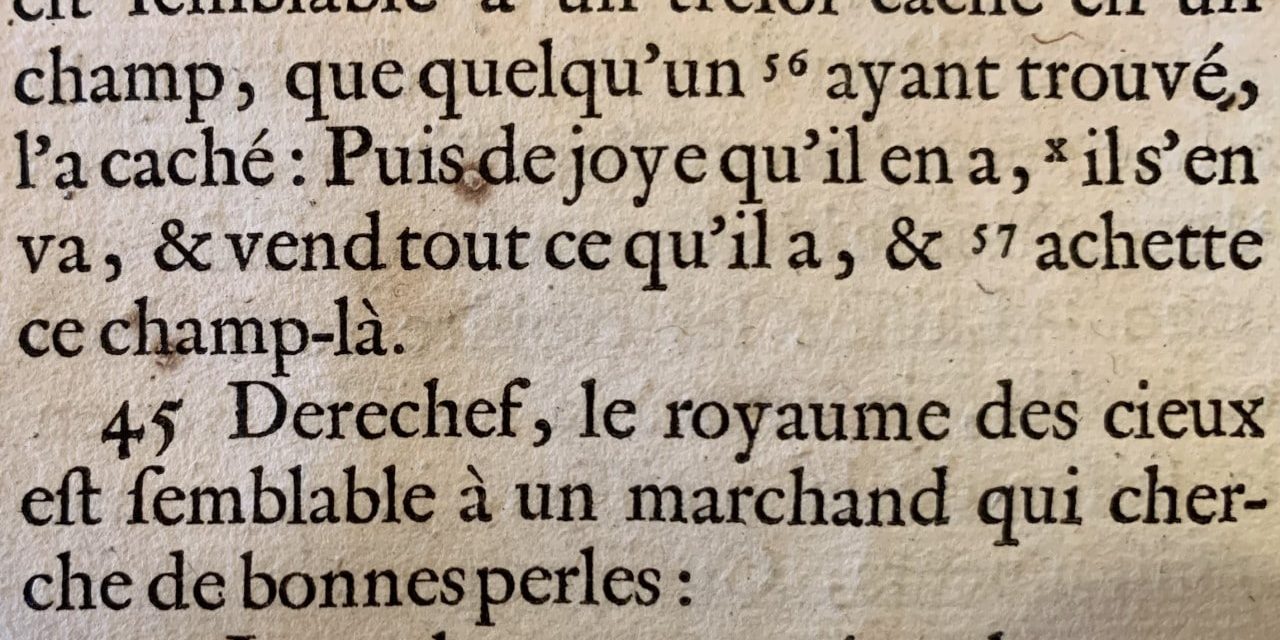 45 Le royaume des cieux est encore semblable à un marchand qui cherche de belles perles.