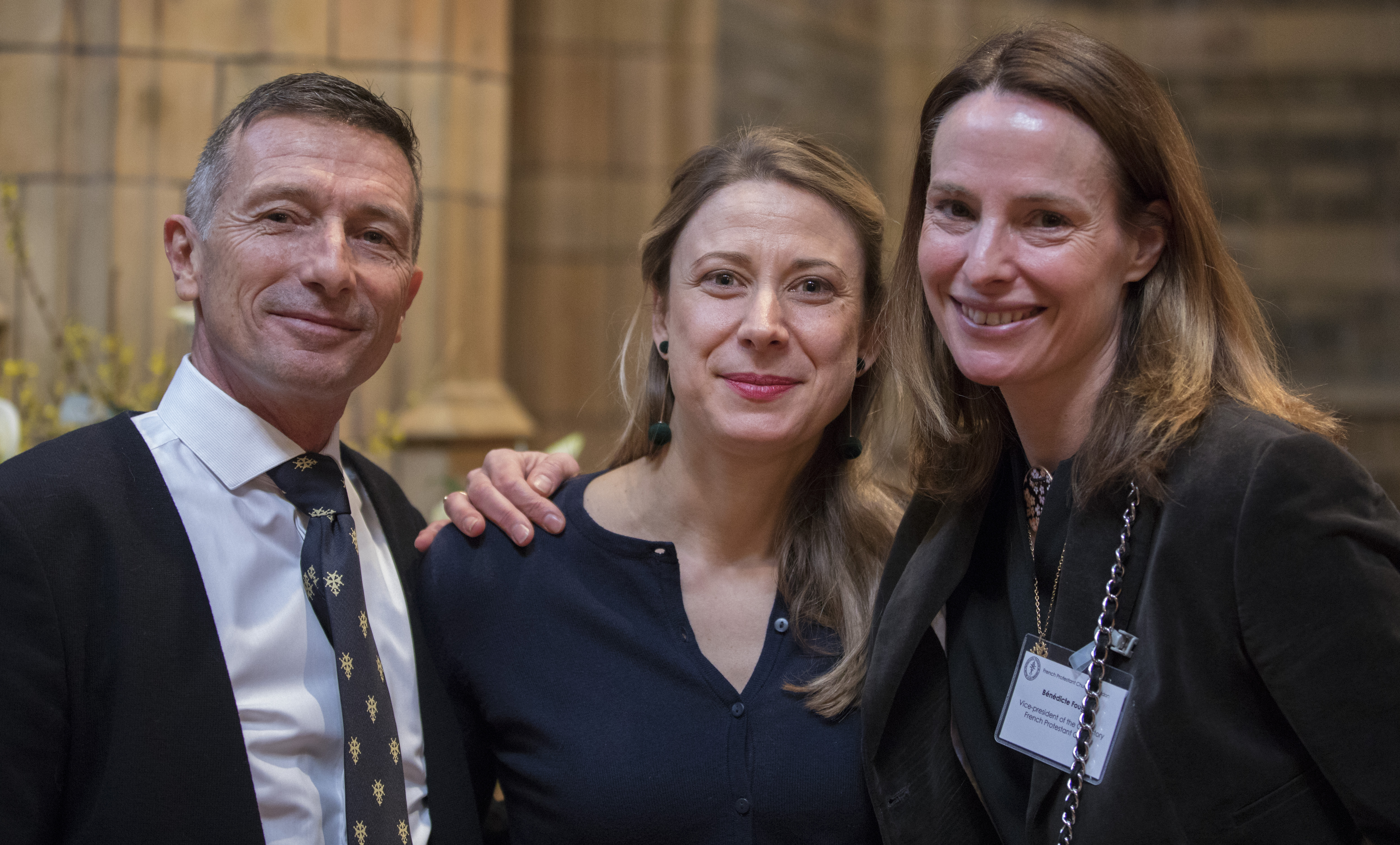 Le pasteur Desmarais avec son épouse Cindy et Bénédicte Fougier, vice-présidente du Consistoire