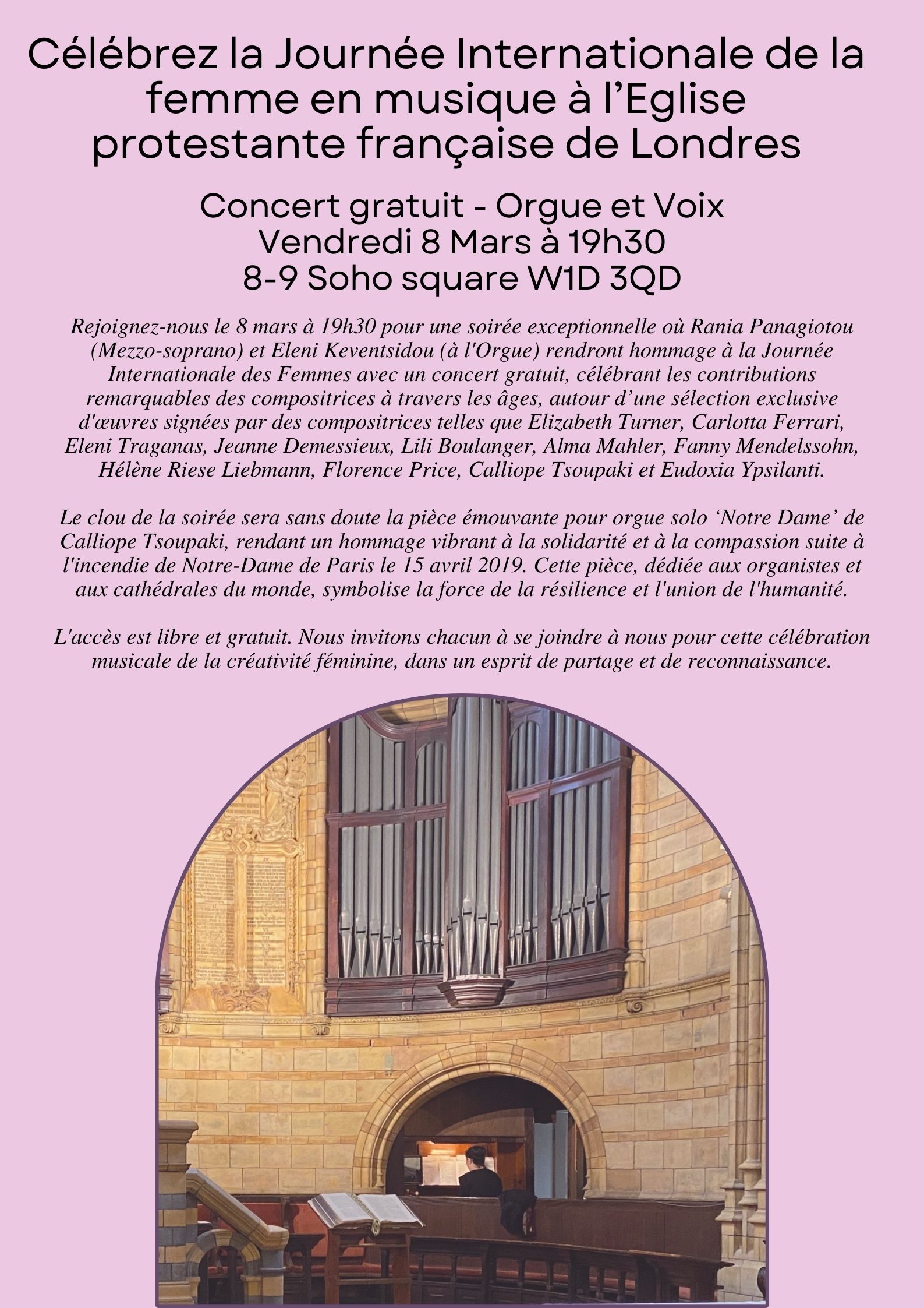 Rejoignez-nous le 8 mars à 19h30 pour une soirée unique ! 🎶 Rania Panagiotou & Eleni Keventsidou célèbrent la Journée Internationale des Femmes avec un concert gratuit, en l’honneur de compositrices. À ne pas manquer : l’émouvante « Notre Dame » de Calliope Tsoupaki.